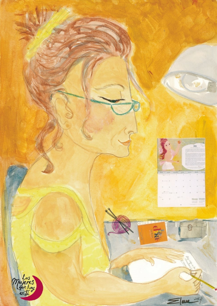 Por eso dibujé para el calendario de septiembre a la sabia consejera, la mujer con foco y rumbo. Me inspiré en la diosa Metis, madre de la estratega Atenea, que poseía la habilidad de comprender una situación desde el intelecto y actuar, además, con gran intuición y destreza.Ella me inspira para desconectar el wifi y el móvil, cerrar la puerta y pensar realmente qué quiero hacer con mi vida en este otoño- invierno y tal vez más adelante aún.